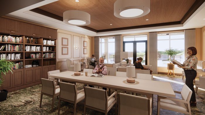 The 38-apartment expansion is carefully planned to encourage shared experiences between assisted living residents and their neighboring independent living friends. Generous dining areas, a flexible theater and event space, a cozy and welcoming library, beautifully designed outdoor environments and more will create natural opportunities for connection. From tasteful accent lighting and richly textured fabrics to natural stone surfaces and timeless wood millwork, every detail reflects a commitment to creating a warm, inviting community where all Butterfield residents feel engaged, supported and at home.
