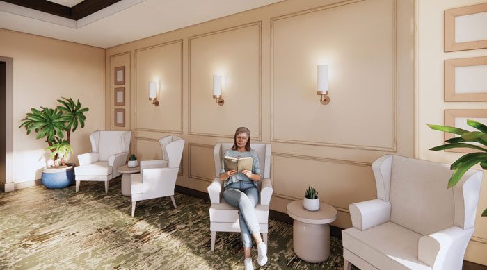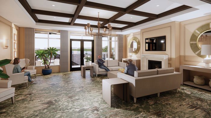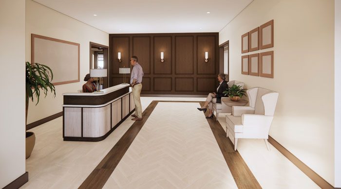 Upon arrival — beneath a large porte-cochere offering protection from the elements — residents and guests will step into a welcoming lobby defined by beautiful wood paneling, bronze accents and natural stone surfaces. Cheerful lighting and thoughtfully layered finishes will create a strong first impression and a warm welcome home.